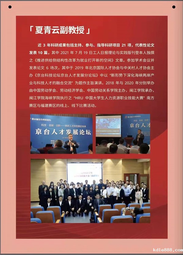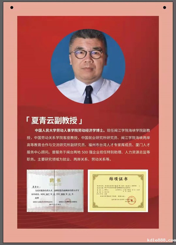 夏青云博士现为竞技宝官网首页登录入口副教授,中国劳动关系学院客座教授,曾服务于闽台两地500强企业并担任特别助理、人力资源总监等职务,主要致力于就业、两岸关系、劳动关系等领域的研究。2018年,国家首次开放台籍教师申请国家社会科学基金项目课题,其《闽台不充分就业问题与影响因素实证比较研究》课题即获国家社会科学基金项目立项,并顺利结项;2019年,夏青云受平潭综合实验区经济发展局委托承担了“中国大陆地区与中国台湾地区部分职业资格比对项目”,以及受福州市人民政府台港澳工作办公室委托承担了“新形势下,深化榕台人才交流合作的对策研究”两项课题的研究。近三年主持、参与、指导科研项目21项,发表代表性论文10篇,且在组织开展“HRU 中国大学生人力资源职业技能大赛”,以及指导学生参与各类创新创业赛事方面不遗余力,并取得了良好的成绩。