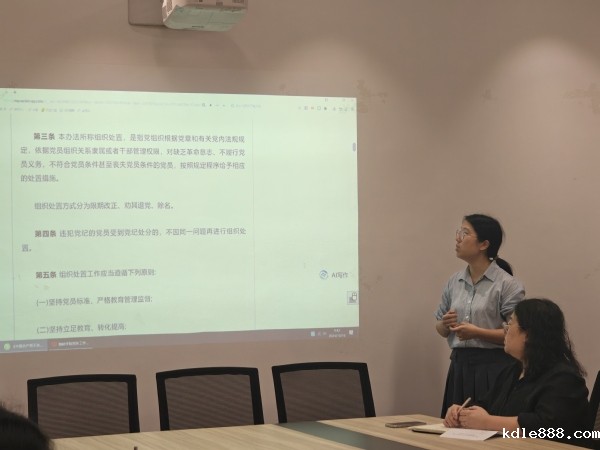 孙莉传达学校党委的文件精神,梳理了学院近期的党务工作重点任务。一是对《不合格党员处置办法》进行解读,做好党员教育管理工作;二是通报近期各支部工作的完成情况,包括“口袋党员”和2024届毕业生党员组织关系转出情况的跟进、党员档案和三会一课检查情况的反馈、党费交纳等;三是部署近期发展党员事宜,包括新一批入党积极分子推优及确定发展对象等工作。